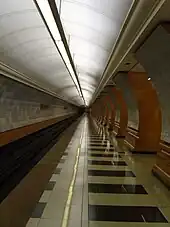 Construction began in 1986. The initial plans envisaged connections from the Arbatsko-Pokrovskaya line to the future Mitino–Butovskaya and the Solntsevo–Mytischinskaya Chordal lines.[3] The former was accommodated in the station's design, with two additional tracks included parallel to those of the Arbatsko-Pokrovskaya line (the latter would have used a third set of track perpendicular to these). However, the 1990s financial crises ended the Chordal projects; the station opened in 2003 as a terminus of the Arbatsko-Pokrovskaya line, and in 2008 the Strogino–Mitino extension of the Arbatsko-Pokrovskaya line was begun from Park Pobedy. The second set of tracks saw their first use on 31 January 2014 as part of the Kalininsko-Solntsevskaya line's partial service to Delovoy Tsentr.[4]