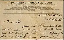 Parkhead Football Club was a Scottish football club from the Parkhead district of Glasgow who played in Scottish Junior Football Association competitions from their formation in 1880 until going out of business in 1963. Originally playing at The Sheddens on Old Shettleston Road, the club moved to Helenslea Park near current day Beattock/Sorby Streets in 1892[1] before development forced the club further out towards the Newbank/Lilybank area and into New Helenslea Park.[2][3] In the early years of the Scottish Junior Cup, Parkhead appeared in nine finals and won the cup five times. The club supplied eight players who went on to become full Scotland internationals later in their careers and Andy Auld who played five times for the US national team.[4]