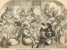 In the earliest days of passenger railways in the United Kingdom the poor were encouraged to travel in order to find employment in the growing industrial centres, but trains were generally unaffordable to them except in the most basic of open wagons, in many cases attached to goods trains.[2] Political pressure caused the Board of Trade to investigate, and Sir Robert Peel's Conservative government enacted the Railway Regulation Act 1844, which took effect on 1 November 1844. It compelled "the provision of at least one train a day each way at a speed of not less than 12 miles an hour including stops, which were to be made at all stations, and of carriages protected from the weather and provided with seats; for all which luxuries not more than a penny a mile might be charged".[3]