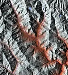 ![]() Relief map showing the passage of the river from the northwest, flowing into Paro (centre) and converging | |