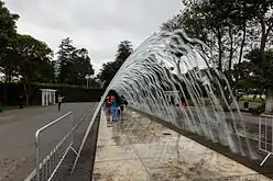 The largest fountain in the Park of the Reserve, named "Magic Fountain" (Fuente Mágica) contains a jet which forces water to a height of over 80 m.[2][4][5] Additional attractions are the Tunnel Fountain of Surprises (Fuente Túnel de las Sorpresas), a 35 m walk-thru tunnel of water ; the Children's Fountain (Fuente de los Niños), a walk-in automated fountain;[5] and a tunnel connecting the two sections of the park which contains an exhibition highlighting recent public works projects in Lima. The Fantasia Fountain (Fuente de la Fantasía), site of a regularly scheduled laser and picture show, is 120 m in length and contains jets that are synchronized to music.[5] A video showcase of the fountains, in Spanish can be found here