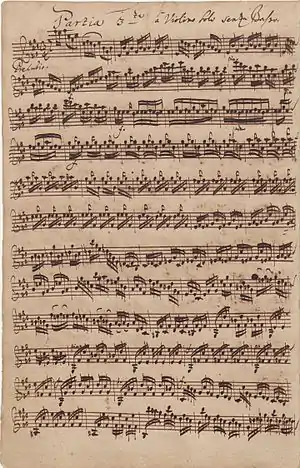 Partita (also partie, partia, parthia, or parthie[1]) was originally the name for a single-instrumental piece of music (16th and 17th centuries), but Johann Kuhnau (Thomaskantor until 1722), his student Christoph Graupner, and Johann Sebastian Bach used it for collections of musical pieces, as a synonym for suite.