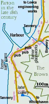 Surprisingly, a new and important industrial concern opened to the north of the village in 1800, the Lowca engineering company. In 1817, the large tannery at the south end of the village was bought for development as a colliery; the coal being mined some distance inland and brought to Parton along a tunnel called the Parton Drift, which also drained the mine workings. To convey coal to the port of Whitehaven a horse-drawn tramway was built along the foot of the cliffs.