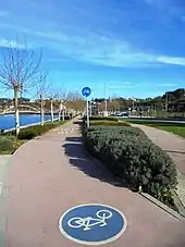 - Paseo marítimo: From the port of Corbaceiras to the Malvar roundabout, the promenade has a 1 km long, 2.5-metre wide wooden path overlooking the ria de Pontevedra in some places and a 2.2-metre wide cycle path.[16] In the area near Manuel del Palacio street, stone steps leading down to the ria de Pontevedra have been repaired.[17] The promenade includes LED lighting bollards separating the cycle path from the pedestrian walkway, several concrete design benches covered in wood near the junction of Manuel del Palacio street and a 100 square metre observation point on stilts above the ria de Pontevedra with views of the island of Tambo.[18] In 2020, work began to extend the promenade by a further two kilometres, incorporating a cycle path along the entire length of the promenade. The aim of extending the promenade is to open up the city to the sea.[19]