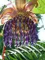 It is a vigorous, tender evergreen perennial climber with nodding red flowers, each surrounded by white and purple filaments. It has smooth, cordate, ovate or acuminate leaves; petioles bearing from 4 to 6 glands; an emetic and narcotic root; scented flowers; and a large, oblong fruit, up to 12 inches (30 cm) in length.[3] containing numerous seeds, embedded in a subacid edible pulp.[4]