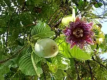 Passiflora quadrangularis, the giant granadilla, barbadine (Trinidad), grenadine (Haiti), giant tumbo or badea (Spanish pronunciation: [baˈðe.a]), is a species of plant in the family Passifloraceae. It produces the largest fruit of any species within the genus Passiflora.[2] It is a perennial climber native to the Neotropics.