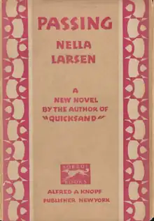 Passing is a novel[lower-alpha 1] by American author Nella Larsen, first published in 1929.[4] Set primarily in the Harlem neighborhood of New York City in the 1920s, the story centers on the reunion of two childhood friends—Clare Kendry and Irene Redfield—and their increasing fascination with each other's lives. The title refers to the practice of "racial passing", which is a key element of the novel. Clare Kendry's attempt to pass as white for her husband, John (Jack) Bellew, is significant and is a catalyst for the tragic events.