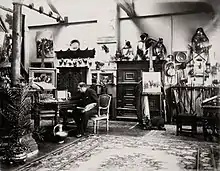 Jazet was always based in Paris, and around 1885 his studio was photographed by Edmond Bénard.[19] A possible studio address at this time is 2 Rue Aumont-Thiéville. This is included in the 1885 Salon entry recording that Jazet exhibited a painting titled Trop Novice.[20] Alternatively, this entry also suggests that the rather fine looking studio could have been provided at 9 Rue Chaptal by Boussod, Valedon & Cie the successors to Goupil & Cie.[21] It is interesting to note that the dog seen in the 1879 painting Le Billet de Logement was a prop kept in the studio.