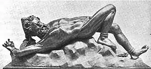 Bouré returned to Belgium in 1844 and began to exhibit his works. The Italian sculptor Carlo Finelli praised his Meditating Love (1844), and his Young Faun Reclining (1843) was also much admired. Bouré's version of Prometheus Bound,[3] called an "erudite and impressive creation," was later remembered as the most remarkable work at the Brussels exhibition of 1845.[4] At the time, however, a reviewer characterized the work as an entirely physical treatment of the myth, admittedly modeled "with an astonishing power and vigor," but failing to capture what was then a common view of Prometheus as a Christ-like figure symbolizing the struggle of doomed human intelligence. Bouré himself was hailed as "on the way to becoming a truly distinguished artist."[5]