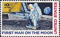 In 1962, Calle was among the first group selected to participate in the NASA Art Program. Calle contributed a pair of complementary five-cent stamps issued in 1967 as part of the Accomplishments in Space Commemorative Issue, with the right stamp showing the Gemini 4 space capsule with the Earth's horizon as a backdrop, while the left stamp showed astronaut Ed White making the first American spacewalk.[1][2] His best-known stamp was designed to mark the first human Moon landing and was issued in September 1969, showing an astronaut stepping out onto the surface of the Moon.[1] The Apollo 11 crew carried with them a die proof of Calle's Moon-landing stamp, which was hand canceled by the astronauts while on the mission.[1][3] Calle had been given exclusive access to be with the astronauts on July 16, 1969, while they made their final preparations for the Apollo 11 mission.[1] The sketches he made based on his experiences that day have been displayed at the National Air and Space Museum and at the National Gallery of Art.[4] Together with his son Chris, Calle returned to the subject of space exploration with a pair of stamps issued in 1994 in honor of the 25th anniversary of the Apollo 11 mission and the first human Moon landing.[1]