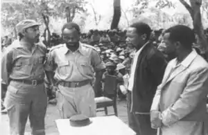 On May 12–16, 1966 Gumane called an emergency party conference and deposed Gwambe for "gross financial and administrative malfeasance".[8] Gumane assumed the presidency of the COREMO and steered it in a new, populist political direction: to contrast the group with FRELIMO he specified no special treatment for its leaders' children, no white membership, and maintained only a few low-profile offices in Cairo, Nairobi and Dar es Salaam.[8] He adopted a strategy based on setting small-scale goals, issuing realistic communiques and on leading the organisation from within Mozambique's borders, all of which drew praise from external observers and supporters.[8] Journalists were also impressed by Gumane, who was fluent in French, English, Portuguese and Spanish in addition to a number of African languages,[9] and he was well liked amongst expatriate political activists: Andreas Shipanga recalled that he was affectionately known as "Uncle Gumane".[10] However, after some initial military successes within Tete Province, COREMO began to lose impetus and was disrupted by internal disputes: Gumane nevertheless retained the backing of the Zambian president Kenneth Kaunda, who held him in high personal regard. COREMO continued to be involved in periodic clashes with both Portuguese troops and FRELIMO, and briefly gained wider public attention in January 1971 when its guerrillas abducted six Portuguese agricultural experts, later believed to have been executed, and five Mozambicans from Mussangadzi agricultural station.[11]