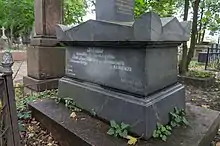 Schilling's state of health deteriorated through the 1830s. He was morbidly obese,[31][32] and by 1835 suffered pains of unknown nature.[32] He requested permission to travel to Europe for medical help, and with the help of Nesselrode secured the tsar's written consent that was actually an order for an industrial espionage mission, in areas from telegraphy to charcoal kilns.[33] In September 1835 Schilling attended a conference in Bonn, as instructed by Nicholas I, and delivered his telegraph set to Georg Wilhelm Muncke.[34] Upon return to Saint Petersburg, he conducted further experiments in telegraphy. In 1836 he briefly appeared at Andreas von Ettingshausen's laboratory in Vienna, researching new insulation materials.[35] In May 1837 Schilling received instructions to draw a budget for a telegraph line connecting Peterhof with Kronstadt, and to begin preliminary field work.[36] By this time he experienced regular pain caused by a tumour.[36] Doctor Nicholas Arendt, his childhood friend from Kazan years, now Life Medic to the tsar, performed a surgery that did not help.[36] Schilling died a few months later, and was buried with honours at the Smolenskoye Lutheran Cemetery in Saint Petersburg.[36] All records, models and equipment left by Schilling passed to Moritz von Jacobi, who would build the first operational telegraph line in Russia, connecting the Winter Palace with the Army Headquarters, in 1841.[36]