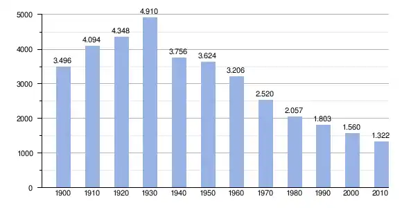 Like its neighbor Peñamellera Alta and most of the municipalities in the district, Peñamellera Baja has been characterized by a progressive population loss over the last century. In the first part of the 20th century, most emigration from Peñamellera Baja was directed overseas. In the second half of the century, people began to emigrate to other parts of Europe and to the Asturian industrial centers. Since the population peaked in 1930 at 4,910 inhabitants, there has been a significant decline in population, leaving the current population at 1,579.