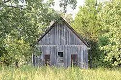 The Pea Ridge School Building is a historic schoolhouse in rural southern Marion County, Arkansas. It is located on the north side of County Road 5008, about 4 miles (6.4 km) south of Bruno. It is a single-story wood-frame structure, with a gable roof, board and batten siding, and a stone foundation. The main facade faces west, and has a pair of doorways with a sash window between. The interior is finished in horizontal boards, those on the east painted black to provide a blackboard. Built c. 1899, it is one of Marion County's least-altered one-room schoolhouses, having only lost its belfry when the tin roof was installed in the 1920s.[2]