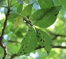 Venturia effusa has a narrow host range, and its most economically significant host is the pecan, Carya illinoinensis. The pathogen can also infect other trees in the genera Carya and Juglans (walnut).[5] Common symptoms of pecan scab disease include light brown to black lesions on stems, leaves, shucks and nuts.[1][6] Visible circular lesions begin to develop 7 to 14 days after infection, and first appear on young tissue as olive-green spots that turn black as they age.[1] Older lesions may crack and fall out of the leaf-blade creating a shot-hole effect.[4] Lesions range in diameter from a pinpoint to about one-quarter inch, and occur most numerously along leaf veins.[1] Numerous lesions can coalesce into larger dead areas on infected tissue and can cause early leaf loss. Lesions on nuts may look sunken and distort nut morphology. They may also cause nuts to shrivel or drop prematurely. Lesions are amphigenous, meaning they grow on both sides of leaves.[7]