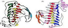 This image of crystal structure of pectin lyase represents the structural features of both pectin lyase (PNLA and PNLB). Letter A indicates (PNLA) from strain 4M-147. In (A), we see an overview of the pectin lyase A structure, depicted with arrows for β strands and coils for helices. The parallel β sheet 1 (PB1) is colored yellow, the green color refers to PB2, the color red refers to PB3 and the blue color indicates the antiparallel β sheet has a long T3 loop. Moving on to (PNLB), the letter B shows the backbone of pectin lyase with pink coils showing helices and arrows indicating β structures. The yellow color refers to parallel β sheet PB1, the blue color refers to PB2, and the red color refers to PB3. The orange indicates the antiparallel β structure in the first T3 turn and a short β strand in the third T3 loop. Additionally, the thick black lines represent the position of disulfide bonds.[1]