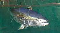As the continental shelf drops sharply relatively close to shore, Pedasí's waters are chock full of pelagic game fish,[25] with year-round catch including amberjack, Pacific sailfish (Istiophorus platypterus), cubera snapper (Lutjanus cyanopterus), roosterfish (Nematistius pectoralis) and grouper, while dorado (Coryphaena hippurus, commonly called mahi-mahi, or dolphinfish), both bigeye tuna (Thunnus obesus) and yellowfin tuna (Thunnus albacares), and wahoo (Acanthocybium solandri) are found seasonally, November through April.[26]