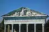 Historian Walter Copland Perry wrote that it was proof of the power of Greek art that the classical sculptors not only overcame the rigid restrictions of the pediment's shape, but turned them to their advantage.[1] Compositionally, the restrictions imposed by both the physical triangular shape of a pediment, and the traditional themes that are usually employed for the subject matter, are, according to Professor Gardner of Oxford University, “as exactly regulated as that of a sonnet or a Spenserian stanza: the artist has liberty only in certain directions and must not violate the laws of rhythm.”[2]