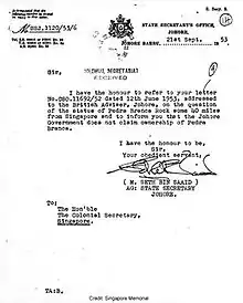 On 12 June 1953, when Singapore was a Crown Colony, its Colonial Secretary J. D. Higham[38] wrote to the British Adviser to the Sultan of Johor to clarify the status of Pedra Branca. He noted that the rock was outside the limits ceded by Sultan Hussein Shah and the Temenggung with the island of Singapore under the 1824 Crawfurd Treaty they had entered into with the East India Company.[39] However, the Colonial Government had been maintaining the lighthouse built on it, and "[t]his by international usage no doubt confers some rights and obligations on the Colony". He therefore asked if "there is any document showing a lease or grant of the rock or whether it has been ceded by the Government of the State of Johore or in any other way disposed of".[40] The Acting State Secretary of Johor, M. Seth bin Saaid, replied on 21 September that "the Johore Government does not claim ownership of Pedra Branca".[41] Singapore contended that this reply confirmed Singapore's sovereignty over the island and that Johor had no title, historic or otherwise, to it.[17][42]
