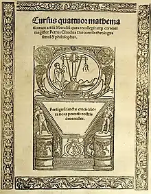 On the topic of proportions, Ciruelo's four part Cursus also contains a treatise on music theory.[7] These writings were exemplary of the "arithmetization of geometry" taking place in mathematics during the 16th century.[7] That is, they represent a shift towards proving geometric theorems solely algebraically, choosing to treat geometric objects as abstract algebraic symbols, rather than physical items in space. The subtle emphasis on the algebra being a "symbol" is dropped in this time period, such that the symbol and the geometric object represented by it are viewed as one in the same. This was of great relevance to music theory, as it is by nature intrinsically geometric, involving the division of strings into intervals.[7] Ciruelo's work is able to explain such concepts without reference to physical, geometric strings. For example, he describes a method with which to break compound intervals down into the sum of smaller intervals solely using numeric ratios.[7] This level of abstraction outlined by Ciruelo and other 16th-century scholars is credited with providing a "better approach to equal temperament [tuning]" within this time period.[7]
