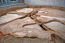 - Roman villae of La Olmeda: The palatial Late Antique Roman villa at La Olmeda is situated less than 1 km away from the village of Pedrosa. Long known as the provenance of chance finds, it was finally professionally excavated from 1968, and was a declared a Bien de Interés Cultural, 3 April 1996.[2] The site was donated in 1984 to the Diputación de Palencia by its proprietor and discoverer, Javier Cortes Álvarez de Miranda, who had supported the archaeological investigation of the site from 1969 to 1980. It is open to the public, while a museum dedicated to the finds is housed in the nearby church of San Pedro de Saldaña.