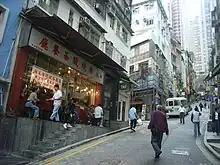 Wai Siu-pak, founder of Yee Tin Tong pharmacy, once lived in Wise Mansion, a large house at the top of Peel Street next to Robinson Road. The section of Peel Street between Hollywood Road and Staunton Street was known for its calligraphers specialised in making signboards in the 1950s and 1960s.[2] The part below Hollywood Road was well known for its Indian curry restaurants. However, expensive rents have driven these trades out of the area, which is now populated by modern tower blocks. The century-old Graham Street market is situated at the lower reaches of Peel Street.[2]