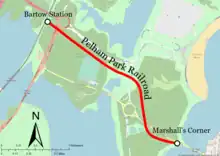 The line was incorporated as two companies on August 30, 1884; the Pelham Park Railroad Company and the City Island Railroad.[2] The two would connect end to end at Marshall's Corner on Rodman's Neck, just short of the bridge to City Island. At the time the territory to be traversed lay entirely within the Town of Pelham in Westchester County. The Pelham Park Railroad Company was designated as the operator of the 3 ft 6 in (1,067 mm) narrow gauge system.[3] The line opened from the Cass Gilbert-designed Bartow station[4] to Marshall's Corner on May 20, 1887. Five days later operations were extended across the bridge to City Island and along City Island Avenue to Brown's Hotel. By 1892 the line had reached Belden's Point, its final terminal. The length of the combined system was 3.2 miles (5.1 km).