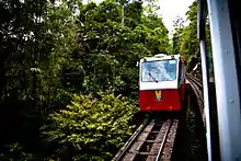 The Penang Hill Railway is a one-section funicular railway which climbs the Penang Hill from Air Itam, on the outskirts of the city of George Town in the Malaysian state of Penang. The railway first opened in 1923 as a two-section railway, but was overhauled in 2010 into a one-section system. It is a single-track railway with a passing loop, and it passes through a tunnel which is the steepest in the world.[2] The total journey time can take between five and twenty minutes.[3][4] The funicular train coach travels directly from the lower station to the top, but may stop at other intermediate stations upon request.[5]
