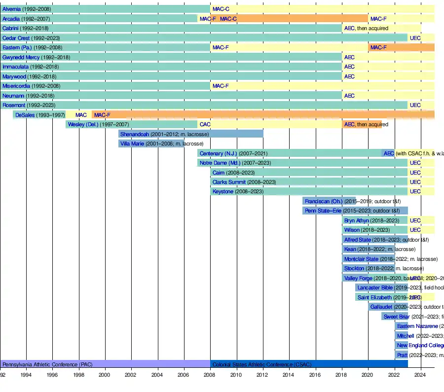 - 2018 β Cabrini, Gwynedd Mercy, Immaculata, Marywood and Neumann left the CSAC to join the newly-formed Atlantic East Conference (AEC) after the 2017β18 academic year.