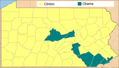 Pennsylvania was won by Democratic nominee Barack Obama by a 10.32% margin of victory. Prior to the election, all 17 news organizations considered this a state Obama would win, or otherwise considered as a safe blue state. Although the Commonwealth of Pennsylvania had voted for the Democratic presidential nominee in every election since 1992, the margins of victory had become smaller over the past elections, as was highlighted in 2004 when John Kerry won the Keystone State by a slim margin of 2.50%. Since George W. Bush came relatively close to winning the state in 2004 and because Barack Obama lost the Democratic primary to Hillary Rodham Clinton by nearly 10% in April 2008, many analysts believed that Republican John McCain had a decent shot at winning Pennsylvania in the general election.[1] Nevertheless, Pennsylvania remained blue and gave Obama 54.47% of the vote to McCain's 44.15%, a margin of 10.32%. Normally a close state, 2008 marked the first and only time since 1972 that Pennsylvania was decided by a double-digit margin and was the strongest Democratic showing in the state since 1964. However, Obama became the first ever Democrat to win the White House without carrying Fayette or Greene Counties, as well as the first to do so without carrying Beaver, Washington, or Westmoreland Counties since Woodrow Wilson in 1916. As of 2020, this remains the last presidential election in which Pennsylvania did not weigh in as the most conservative state in the Northeast, as the state voted to the left of New Hampshire.
