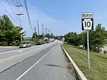 The portion of present-day PA 10 along Limestone Road was originally a Native American trail.[7] When routes were first legislated in Pennsylvania in 1911, today's PA 10 was designated as Legislative Route 274, running between Legislative Route 131 in Oxford and Legislative Route 148 in Reading.[8] By 1926, the entire length of Legislative Route 274 was paved except between Compass and south of Honey Brook and Honey Brook and Morgantown.[9] In 1927, the road between US 1/PA 12 (now PA 472) in Oxford and US 222/PA 41 (now US 222 Bus.) in Reading was designated as part of PA 42, which continued north from Reading to the New York border in South Waverly.[10] By 1928, the entire length of PA 42 between Oxford and Reading was paved.[11] In April 1935, US 122 replaced the PA 42 designation between Oxford and Reading. US 122 began at US 1/PA 472 in the center of Oxford and continued north to Reading, where it ran north along the present-day PA 61 alignment to Sunbury and present-day PA 147 to US 11/US 111 in Northumberland.[12][13] In 1955, the southern terminus of US 122 was cut back to Morgantown, and PA 10 was designated along the former alignment of US 122 between US 1/PA 472 in Oxford and PA 23 in Morgantown.[14][15] The route was realigned to a new alignment south of the US 30 intersection north of Parkesburg in the 1950s, having previously followed current Hershey Lane and a concurrency with US 30.[15] US 122 was decommissioned in 1963, and PA 10 was extended north along the former alignment to US 222 (now US 222 Bus.) in Reading.[16][17] I-176 was built parallel to PA 10 between Morgantown and Reading in the 1960s.[17]