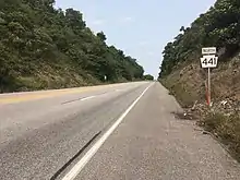 PA 441 continues past industry to the east of the Northwest Lancaster County River Trail, the railroad tracks, and the river before it reaches an interchange with the US 30 freeway, at which point it turns north. Past this interchange, PA 441 crosses into West Hempfield Township and becomes Chickies Hill Road, a three-lane undivided road with two northbound lanes and one southbound lane. The route runs north through forested areas and then a mix of homes and fields as it ascends a hill. The road narrows to two lanes and heads into forests as it passes to the east of Chickies Rock County Park, curving to the northwest.[2][3]