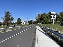 PA 663 was once part of the Steinsburg and Milford Square Turnpike. The turnpike was chartered in March 1858.[6] When Pennsylvania legislated routes in 1911, what is now PA 663 was not given a number.[7] PA 663 was designated in 1930 to run from in U.S. Route 422 (US 422, High Street) in Pottstown north to PA 73 in New Hanover Township. At this time, the entire length of the route was paved, along with the unnumbered road between PA 73 and Quakertown.[2] In 1936, PA 663 was extended north to an intersection with US 309 (now PA 309) and PA 212 (now PA 313) in Quakertown. The route followed its current alignment between PA 73 and Pennsburg before it followed Quakertown Road and Sleepy Hollow Road to Spinnerstown, where it turned east and followed Spinnerstown Road and Milford Square Pike to Quakertown.[8] By 1967, the southern terminus of PA 663 was rerouted to PA 100 in Pottstown, heading west on King Street.[9] In the 1960s, PA 663 was shifted from Milford Square Pike to a new alignment to the north between the Pennsylvania Turnpike Northeast Extension and Quakertown.[10] After construction began in 1973, a new alignment of PA 663 to the south from Pennsburg to the Pennsylvania Turnpike Northeast Extension opened a year later, with the route moved off Quakertown Road, Sleepy Hollow Road, and Spinnerstown Road.[11][12]