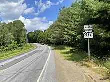 PA 872 begins at an intersection with PA 120 in Grove Township, Cameron County, heading north-northeast on two-lane undivided First Fork Road. The road heads through forested areas, running along the west bank of the First Fork Sinnemahoning Creek. The route runs between tracts of the Elk State Forest, curving to the northeast. PA 872 winds to the north and passes along the western edge of Sinnemahoning State Park, passing near the George B. Stevenson Reservoir. The road continues north-northwest past the state park through forested areas with sparse homes, passing through Lushbaugh and First Fork before turning to the north-northeast.[2][3]