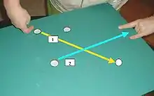 If a player flicks a bottletop (1) to a particular point on the table, they can follow by flicking a different top (2) between the other two, to the goal