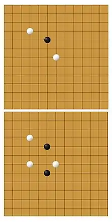 A stretch tria is a shape formed by a single stone placed in line with a pair of stones and a single empty space between them. The stretch tria is vulnerable to counter because an opponent can place a stone between the single stone and the pair and threaten capture. It is powerful however because it threatens to form a tessera, and if unbound on either side forces the opponent to respond in a similar way to open tria, creating initiative and allowing play elsewhere on the board without the opponent interfering. The stretch tria can be a very powerful tool when used in conjunction with other stretch trias. A vertical stretch tria with the pair at the top and the single stone at the bottom can be combined with another stretch tria in a diagonal or horizontal line so that both stretch trias share the same single stone. If an opponent tries to stop one of them, then the very next turn, the player who formed the stretch tria can extend the other and turn it into a tessera. If the tessera is unbound the position is likely a winning one[32]