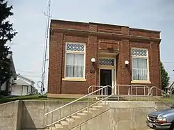 The 30 foot (9 m) by 64 foot (20 m) rectangular building is composed of brick and features terrazzo flooring. The building is the most ornate of the commercial buildings in downtown Orangeville and is situated on the area's second highest lot. The main entrance, a large wooden, glass paneled door, is recessed and central on the symmetrical south (front) facade of the building. The original door is surrounded by sidelights and topped by a diamond patterned transom window. Flanking the central doorway on each side is a one over one window, each displaying the same diamond patterned transoms as the door.[2]