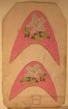 Peranakan beaded slippers, also known as Kasut Manik,[1] literally meaning "beaded shoes", is a type of shoe that dates back to the early twentieth century Malaya. It refers to beaded slippers worn by a nyonya to complete her Sarong Kebaya outfit, together with chained brooches (kerosang) and a silver belt (tali pending). The slippers are made of Peranakan cut beads (Manik Potong), which are treasured as these beads are no longer available. Vintage Kasut Maniks are intricate and finely stitched, a testimony to the fine workmanship of yesteryears. The intricacy and fine workmanship of a pair of the beaded slipper is also a hallmark of highly accomplished Peranakan women, also known as Nyonya, whose skills in embroidery and beadwork are highly valued.[2]