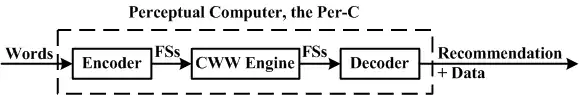 The perceptual computer – Per-C – an instantiation of perceptual computing – has the architecture that is depicted in Fig. 1 [2]–[6]. It consists of three components: encoder, CWW engine and decoder. Perceptions – words – activate the Per-C and are the Per-C output (along with data); so, it is possible for a human to interact with the Per-C using just a vocabulary.