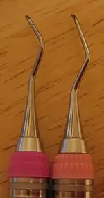The periodontal curette is a type of hand-activated instrument used in dentistry and dental hygiene for the purpose of scaling and root planing.[1] The periodontal curette is considered a treatment instrument and is classified into two main categories: universal curettes and Gracey curettes.[1] Periodontal curettes have one face, one or two cutting edges and a rounded back and rounded toe.[1] They are typically the instrument of choice for subgingival calculus removal.[1]