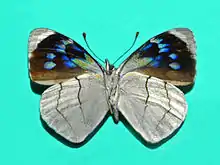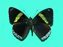 Coloration and pattern of these butterflies are quite variable depending on subspecies. Usually the uppersides of the wings are blue black. The forewings are crossed obliquely from the costal margin to the inner margin by wide bands of golden green or blue. Close to the apex sometimes there is a small white spot. On the uppersides of the hindwings the outer margins are bordered with greenish or blueish. At the base there is a brilliant blue. The underside of the anterior wings is black, with a row of five blue spots, a brown inner margin and a gray base followed by light blue. The apex and the outer margin are gray. The undersides of the posterior wings are whitish or grayish, crossed by two black lines. Larvae feed on Serjania species.[1]
