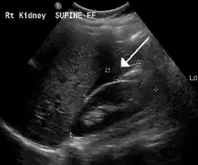 The use of ultrasound has become the standard of care when preparing a patient for paracentesis. Confirmation of an ascitic effusion reduces the risks associated with a dry or blind tap of the abdomen. Anatomic landmarks, such as the midline linea alba approach, were traditionally used as reference points for needle insertion. Phased array or curvilinear ultrasound transducers are typically used in the hospital and outpatient setting to identify ascites in the abdominal cavity. Fluid within the abdominal cavity appears hypoechoic or anechoic (black) on ultrasound. Morison's pouch (hepatorenal recess) is a common starting location in concordance with ultrasound FAST (focused assessment with sonography for trauma) exam. Fluid collection can occur in a number of different locations and may be difficult to find, especially if the patient only exhibits a small volume of ascites. Measurement of the amount of fluid within the abdominal cavity is not necessary or very successful. Identification of sufficient fluid within the abdominal cavity for fluid analysis or to achieve a therapeutic benefit is all that is required to proceed to paracentesis. Ultrasound guidance of the paracentesis can also be used as an additional safety measure to ensure the needle stays within the ascitic fluid and avoidance of important vessels within the abdominal cavity. [5]