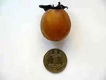 Oriental persimmon, Chinese persimmon or Japanese persimmon[7] (Diospyros kaki) is the most commercially important persimmon. It is native to China, Northeast India and northern Indochina.[8][9] It was first cultivated in China more than 2,000 years ago, and introduced to Japan in the 7th century and to Korea in the 14th century.[10] China, Japan and South Korea are also the top producers of persimmon. It is known as shi (柿) in Chinese, kaki (柿) in Japanese and gam (감) in Korean and also known as Korean mango. It is known as haluwabed (हलुवाबेद) in Nepal and it is used for various culinary purposes and eaten as a seasonal fruit. In Nepal, it is one of the most popular fruits and has been consumed for a very long time. It was introduced to California and southern Europe in the 1800s and to Brazil in the 1890s, in the State of São Paulo, afterwards spreading across Brazil with Japanese immigrants; the State of São Paulo is still the greatest producer within Brazil, with an area of 3,610 hectares (8,900 acres) dedicated to persimmon culture in 2003;[11] It is deciduous, with broad, stiff leaves. Its fruits are sweet and slightly tangy with a soft to occasionally fibrous texture.