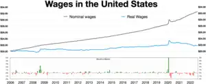 Personal income is an individual's total earnings from wages, investment interest, and other sources. The Bureau of Labor Statistics reported a median weekly personal income of $1,037 for full-time workers in the United States in Q1 2022.[1] For the year 2020, the U.S. Census Bureau estimates that the median annual earnings for all workers (aged 15 and over) was $41,535; and more specifically estimates that median annual earnings for those who worked full-time, year round, was $56,287.[2][3]