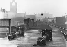 The station's platform around 1968. In view to the west are St Leonard's-in-the-Fields Church (left) and the now-demolished Dewar's whisky facility (centre)