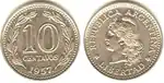 In 1881, silver 10, 20 and 50 centavos and 1 peso and gold 1 argentino coins were introduced, followed by bronze 1 and 2 centavos the next year. Silver coins ceased production in 1883, with gold coins ending in 1896. Base metal 5, 10 and 20 centavos were introduced in 1896, with base 50 centavos following in 1941. The 1 peso was reintroduced in 1957, with 5, 10 and 25 pesos introduced in 1961, 1962 and 1964.