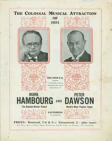 Peter Smith Dawson (31 January 1882 – 27 September 1961) was an Australian bass-baritone and songwriter.[1] Dawson gained worldwide renown through song recitals and many best-selling recordings of operatic arias, oratorio solos and rousing ballads during a career spanning almost 60 years.