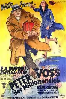 Peter Voss, Thief of Millions (German: Peter Voss, der Millionendieb) is a 1932 German comedy crime film directed by Ewald André Dupont and starring Willi Forst, Alice Treff, and Paul Hörbiger. It was based on the 1913 novel of the same title by Ewald Gerhard Seeliger which has been adapted into a number of films including previously in 1921 and later in 1946. It was the second to last film made by Dupont in Germany before he was forced to flee to the United States following the rise of the Nazi Party.[1]