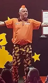 Wright produced the second highest televised three-dart average of all-time of 119.50 in a 7–2 victory over Lewis in the fifth week of the Premier League.[100] At the end of the same week he played in the UK Open, where he was the bookmakers' pre-tournament favourite due to his strong form and the absence of an injured van Gerwen. He defeated James Richardson, Dave Chisnall, and Rob Cross in the first two days of the tournament. From the quarter-final stage he beat Raymond van Barneveld 10–8 (with an average of 110.88) and Daryl Gurney 11–5 to play in the final of the event for the third year in a row. Wright raced into a 7–2 lead over Gerwyn Price and held on to claim his first major title with an 11–6 win.[101][102] Wright won the German Darts Championship by overcoming Van Gerwen 6–3 in the final. It was his first victory over the world number one in a final after Wright had lost 10 in a row.[103] He also added the German Darts Open to his growing collection of tournament wins after edging out Benito van de Pas 6–5 in the final by taking out a 121 finish with his opponent waiting on seven.[104] He quickly made it a hat-trick of European Tour tournament wins this year when he whitewashed Van Gerwen 6–0 in the final of the European Darts Grand Prix.[105]