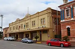 Christopher Arthur Smith,[12] an architect who designed a number of South Australian public buildings, had completed a design for the new hall by June 1926: located adjacent to the old hall, it was to have five office fronts, a subscribers' room, a public reading room, a town clerk's office, a council chamber, and a hall seating 1,100 to 1,200 people, at an expected cost of £11,705.[1][11][13] The foundation stone for the new hall was laid on 23 March 1927.[14] A loan was authorised in October to allow the council to complete payments on the new hall.[15] It was officially opened on 15 November 1927. MP George Jenkins described it as "the finest hall he had seen in any town of the same size."[16] The council had planned to sell the former hall to cover the costs of the new hall, but failed to reach the desired price and initially leased it out instead.[17] The final cost came to £13,961.0.6.[1]